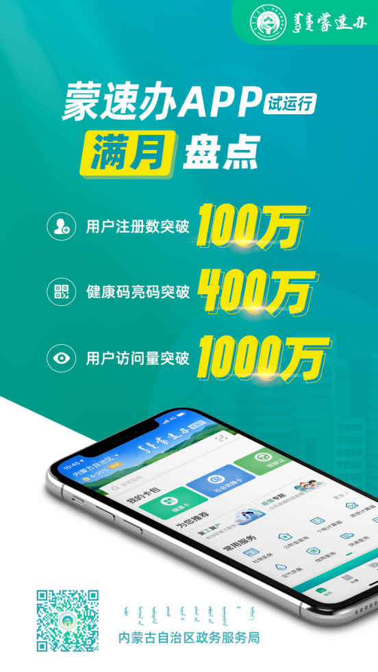 4月14日,“蒙速辦”APP在試運行滿月之際,實現(xiàn)注冊用戶突破100萬,累計訪問量超過1000萬次。“蒙速辦”是內(nèi)蒙古自治區(qū)政務(wù)服務(wù)局負(fù)責(zé)建設(shè)的全區(qū)一體化在線政務(wù)服務(wù)移動端,為全力打造政務(wù)服務(wù)“掌上辦”“指尖辦”邁出堅實的第一步。