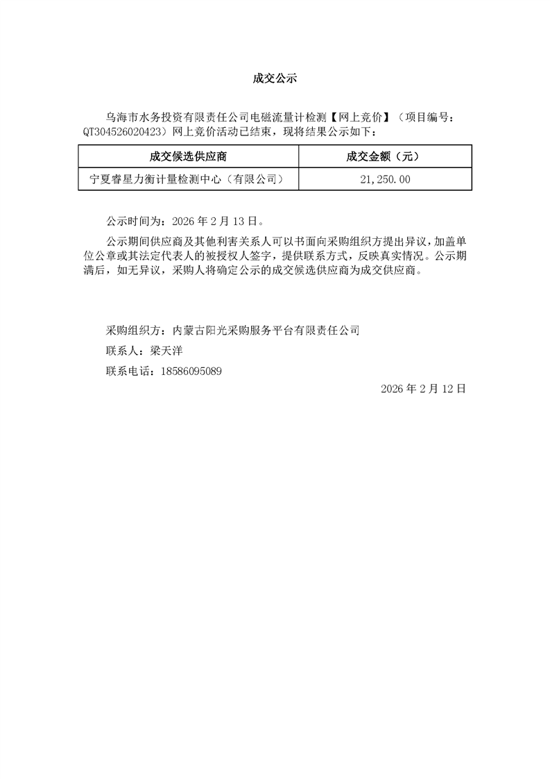 烏海市水務(wù)投資有限責(zé)任公司電磁流量計(jì)檢測(cè)【網(wǎng)上競(jìng)價(jià)】結(jié)果公示