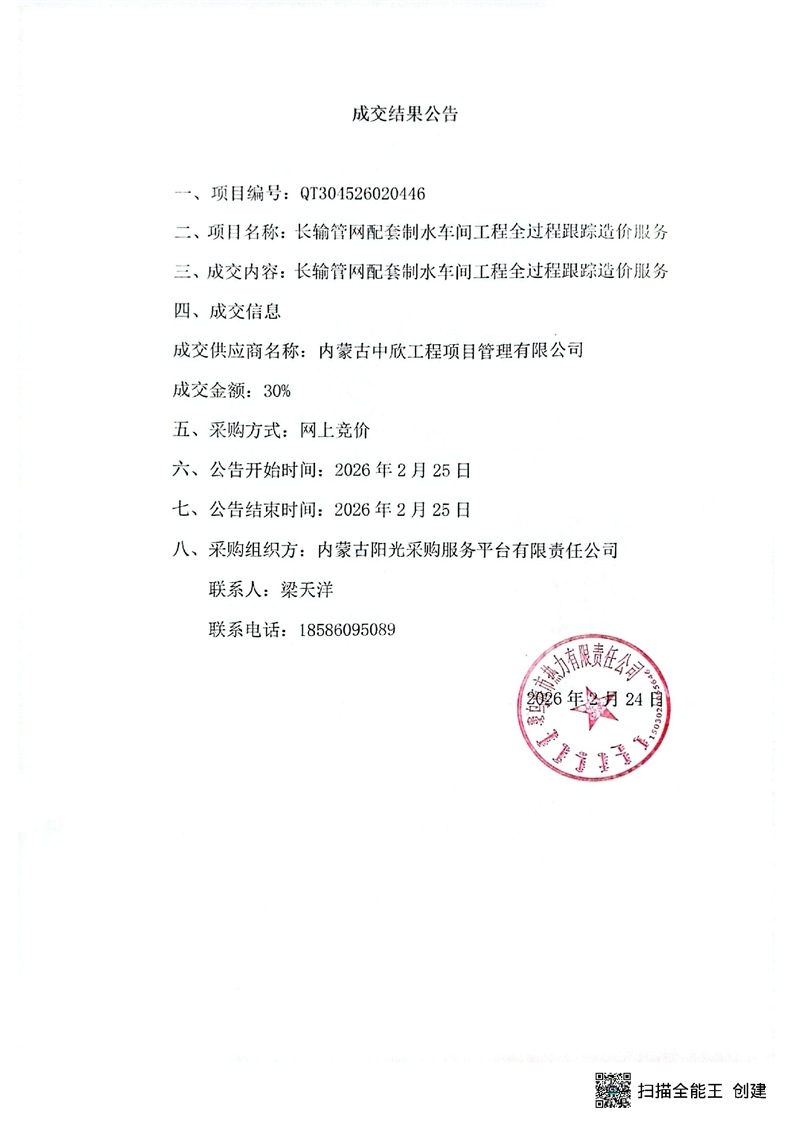 長輸管網(wǎng)配套制水車間工程全過程跟蹤造價(jià)服務(wù)成交結(jié)果公告